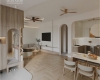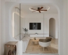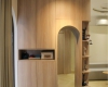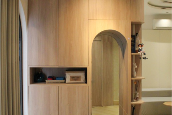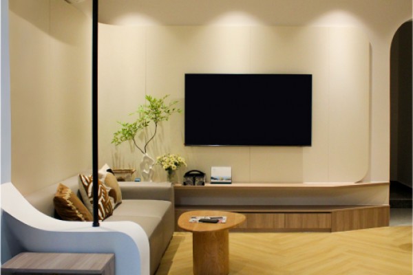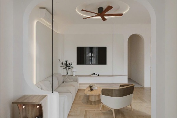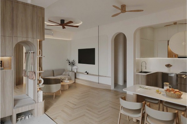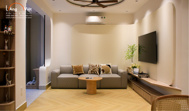 Một căn nhà nhỏ với phong cách hiện đại, nhưng vẫn tạo nên một không gian sống ấm cúng và sang trọng nhờ vào thiết kế thông minh và điểm nhấn bằng gam màu nâu ấm áp. Bằng những lối thiết kế phòng khách thông với nhà bếp, Làng Việt đã khéo léo sử dụng các đường nét cong và hình khối đơn giản để tạo nên tổng thể hài hòa và không hề gò bó.