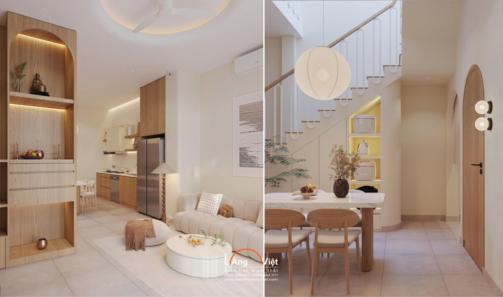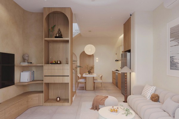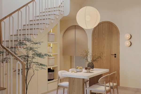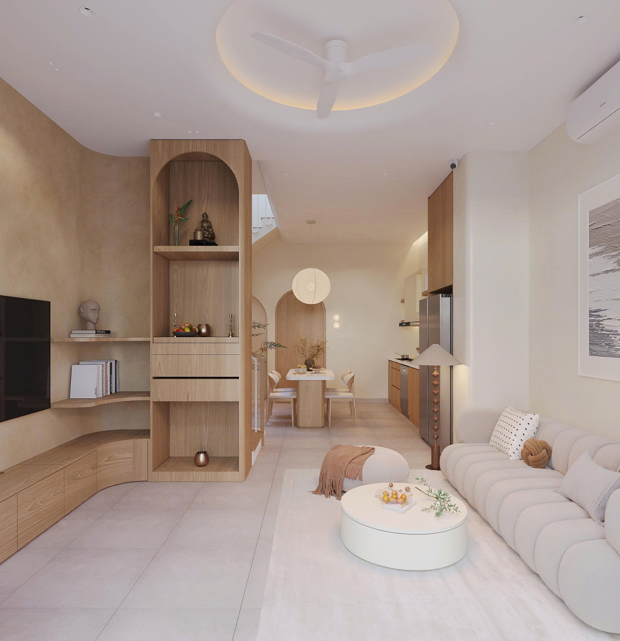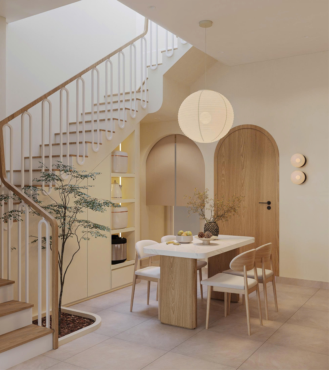 Nội thất nhà phố phong cách Japandi với gỗ sồi sáng và hệ cửa vòm cong mềm mại.