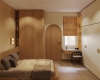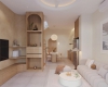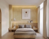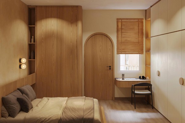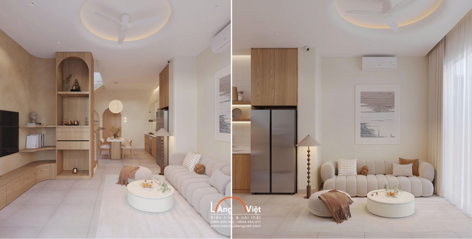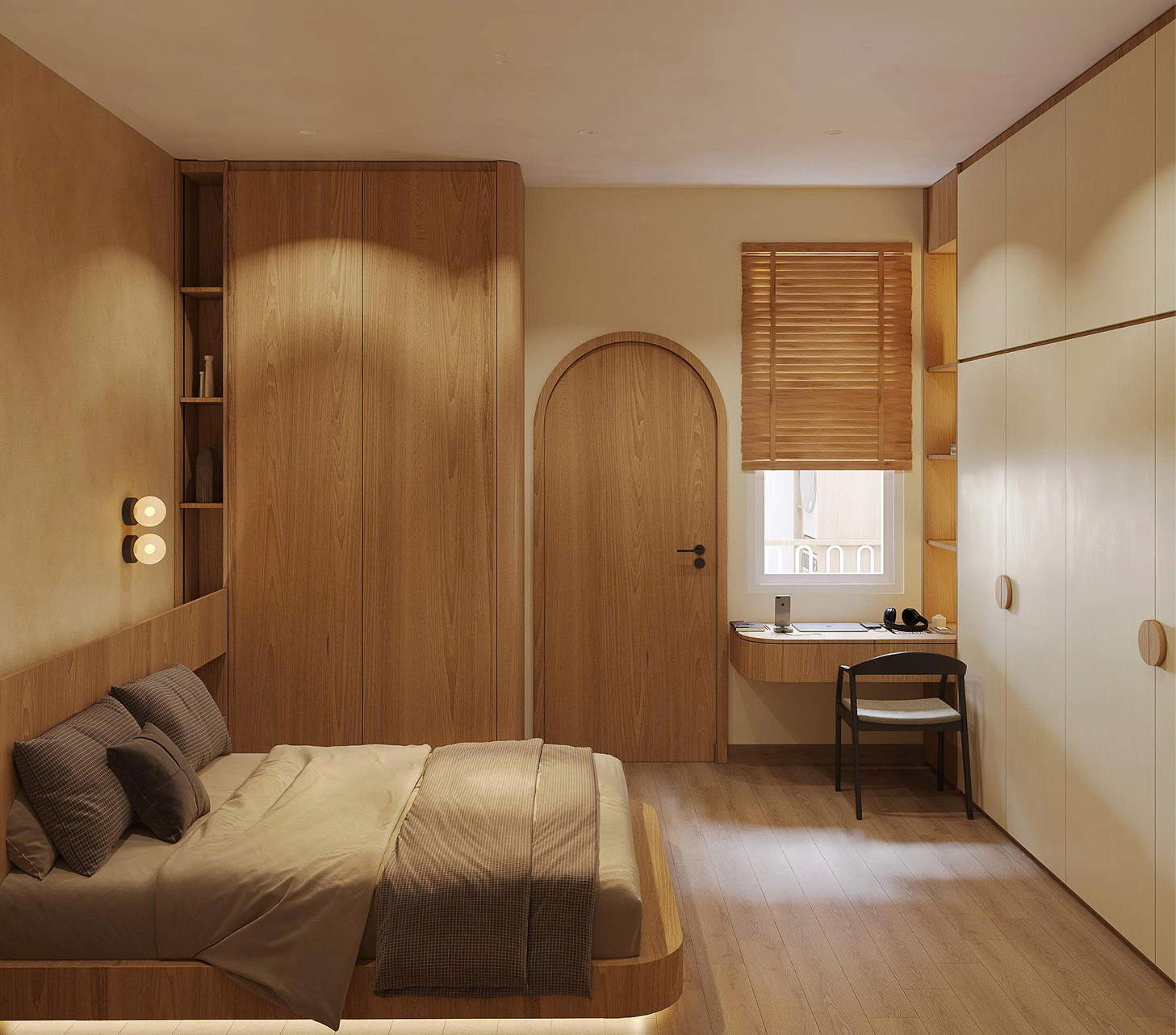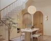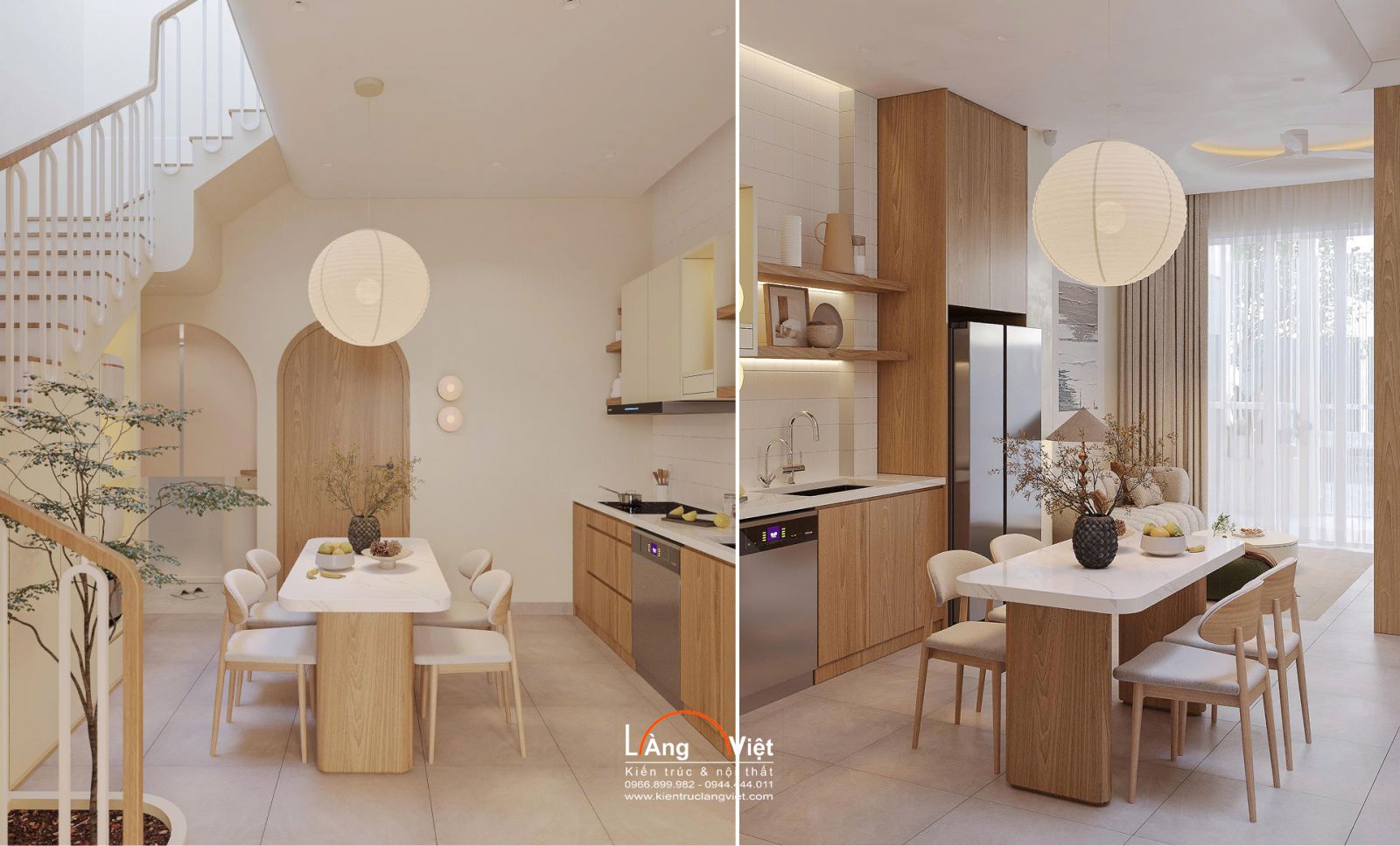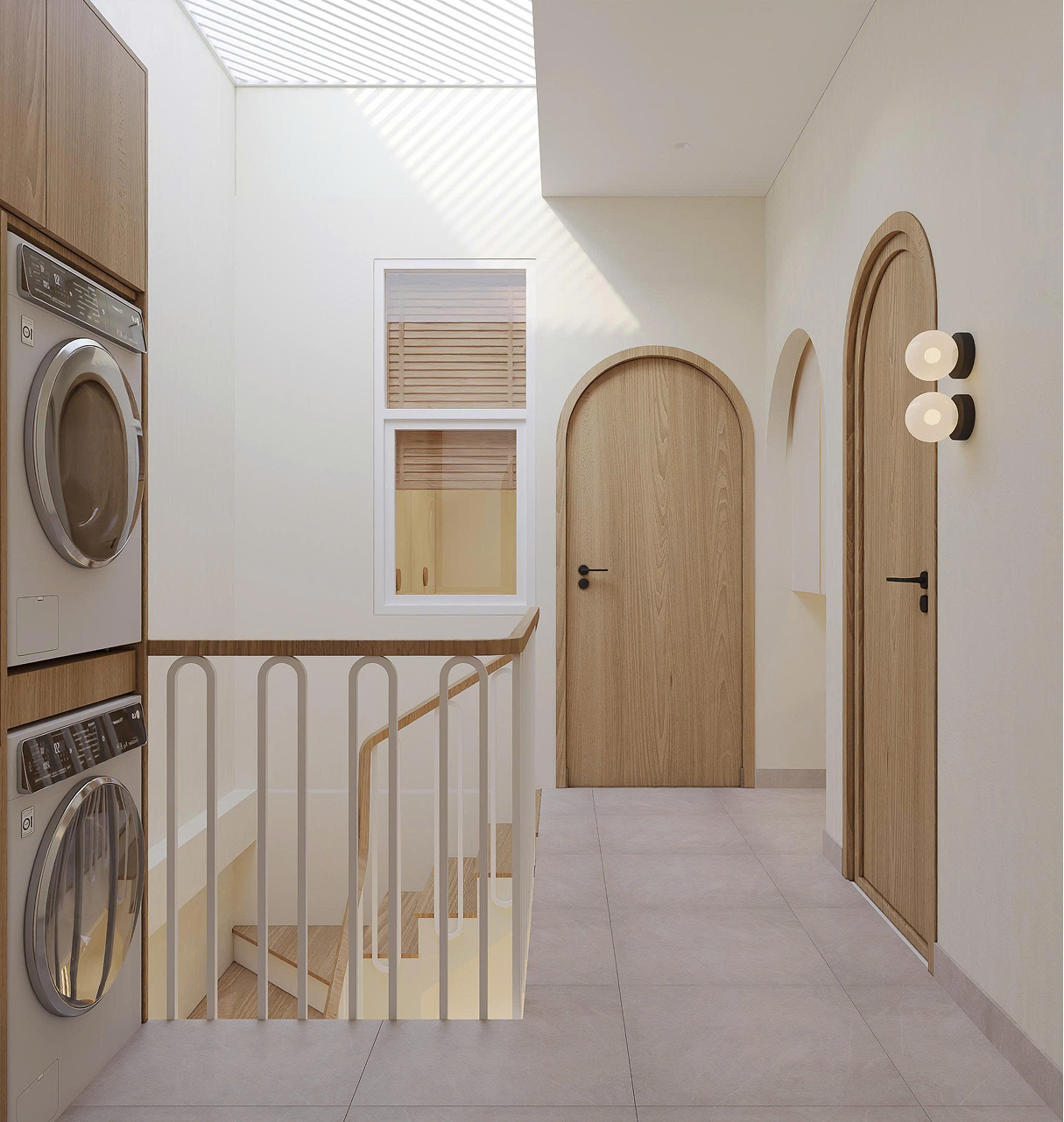 Nội thất nhà phố phong cách Japandi với gỗ sồi sáng và hệ cửa vòm cong mềm mại.