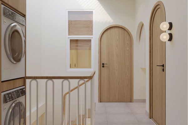 Điểm sáng tinh tế nhất trên mặt bằng lầu 1 không chỉ nằm ở hai phòng ngủ được trang bị hệ tủ kịch trần gọn gàng, mà nằm ở Khu vực Giặt Sấy.