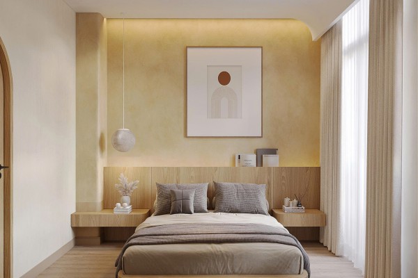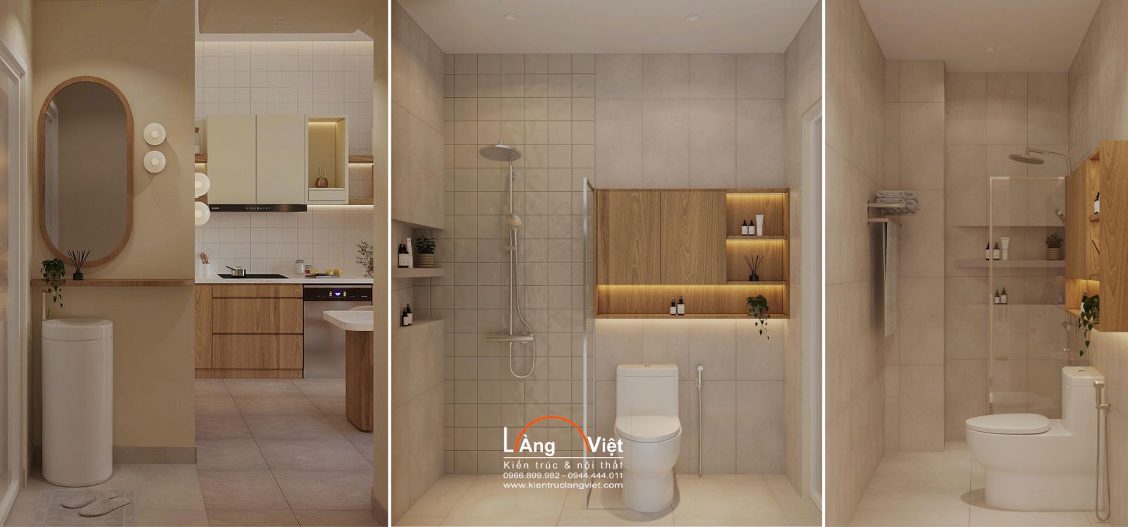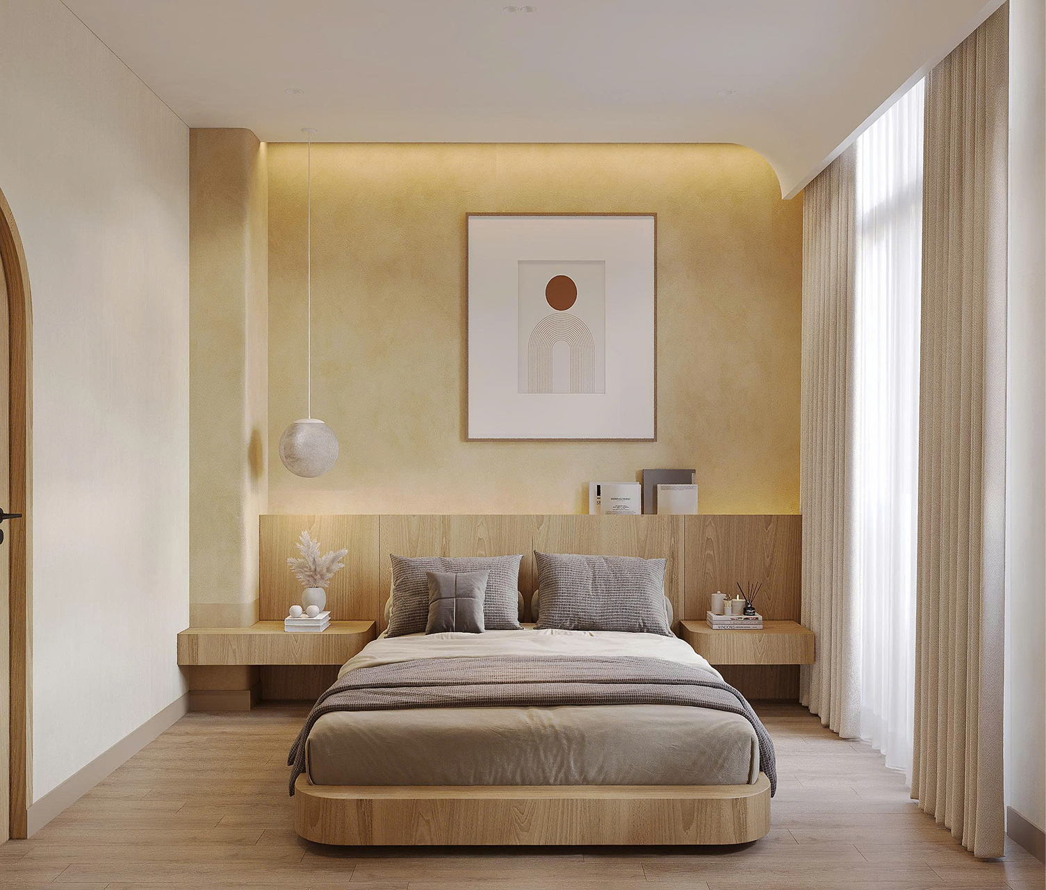 Vật liệu chủ đạo: Xuyên suốt không gian từ phòng khách, bếp đến phòng ngủ là sắc vàng ươm ấm áp của gỗ sồi tự nhiên, kết hợp cùng nền tường trắng kem. Bảng màu này giúp phản xạ ánh sáng tối đa, khiến ngôi nhà lúc nào cũng như đang bừng nắng.