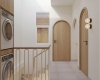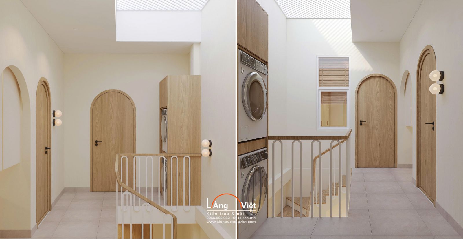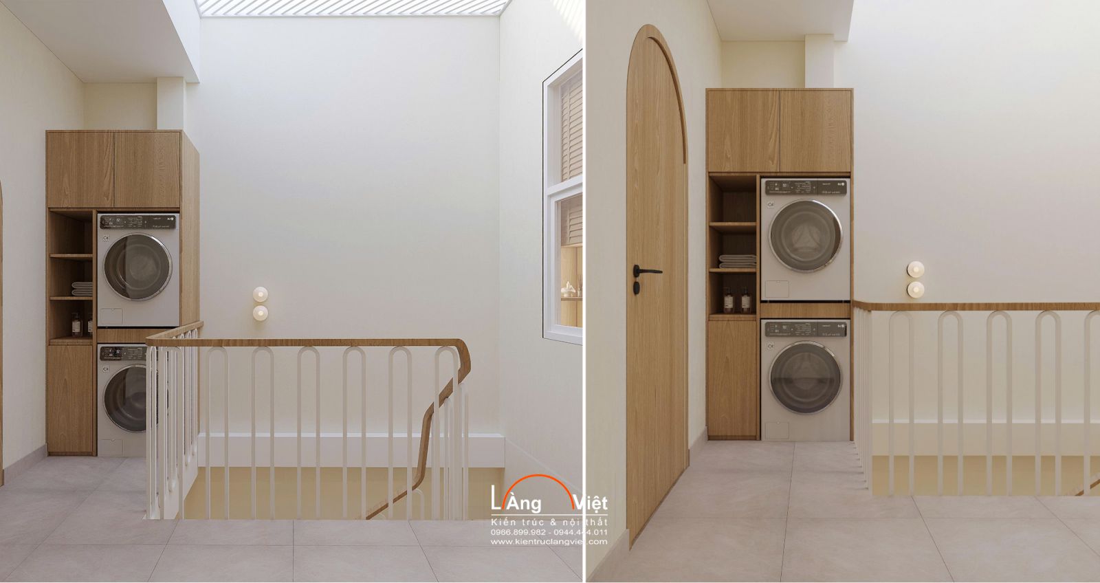 Thay vì đẩy máy giặt lên sân thượng chót vót hoặc nhét vào góc vệ sinh chật hẹp, chúng tôi bố trí một khu vực giặt sấy riêng biệt ngay tại sảnh thang lầu 1, sát cạnh giếng trời.