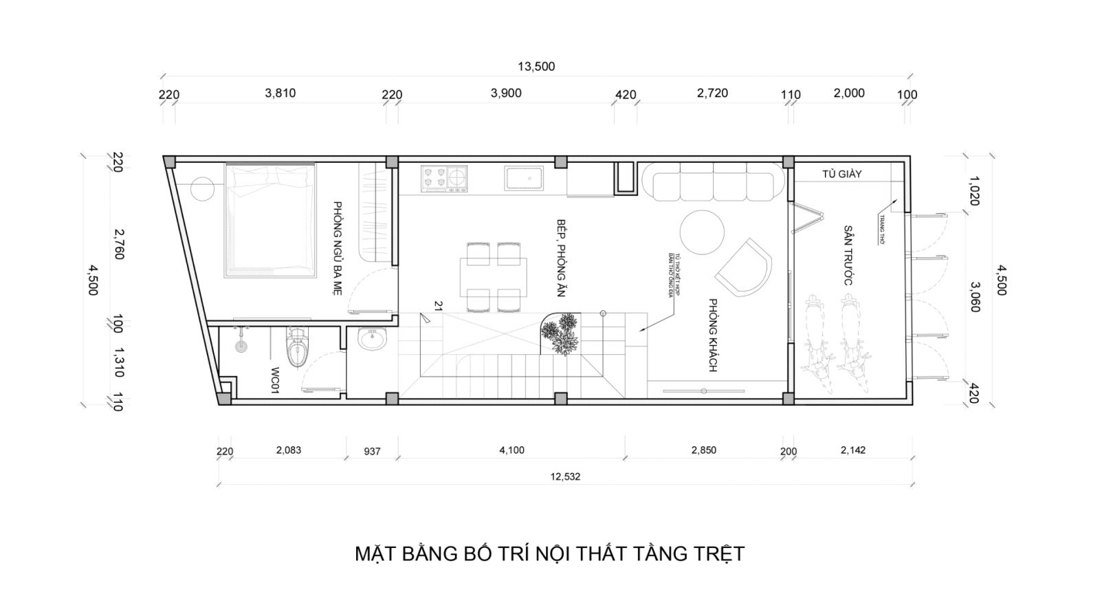 Thách thức lớn nhất của dự án này nằm ở mặt bằng tầng trệt: Chiều dài nhà không quá sâu, lại bị vát xéo một góc lớn ở phía cuối nhà. Thêm vào đó, gia chủ yêu cầu phải có một phòng ngủ ở tầng trệt dành cho ba mẹ lớn tuổi để hạn chế leo cầu thang.