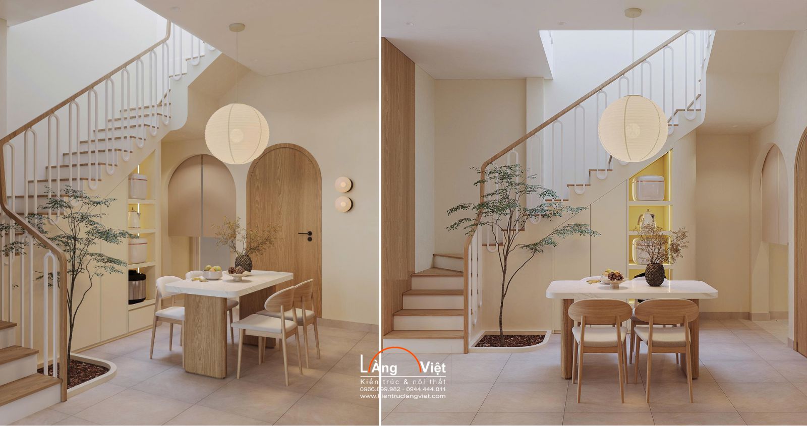 Gầm cầu thang được tận dụng làm tủ lưu trữ vật dụng bếp. Giúp tăng không gian cho khu vực sinh hoạt.