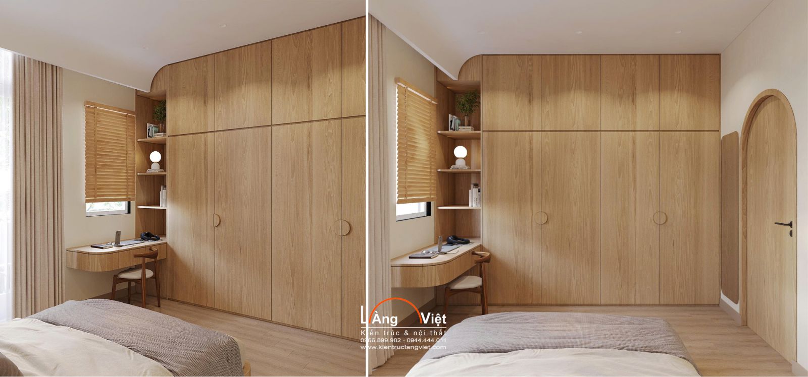 Kết quả là gì? Phần diện tích dành cho giường ngủ được "nắn" lại vuông vức hoàn toàn. Không gian sinh hoạt chung phía ngoài (Khách - Bếp) cũng giữ được hình khối chữ nhật hoàn hảo, tạo cảm giác rộng rãi và chuẩn phong thủy.