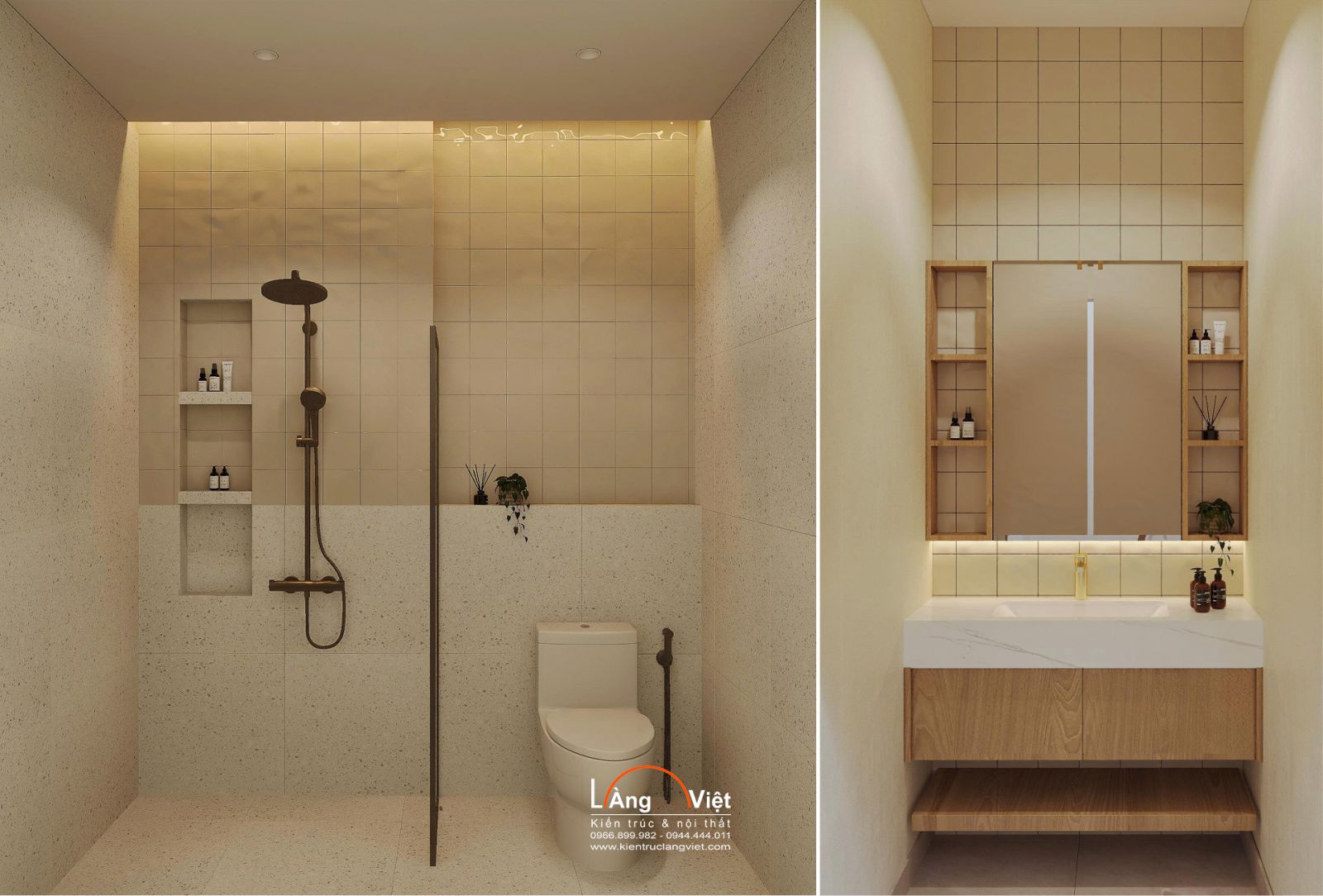 Chi tiết "đắt giá": Hãy chú ý đến những ô cửa, vách ngăn và gương soi. Chúng tôi sử dụng rất nhiều đường vòm cong (Arches). Những đường cong này có tác dụng trung hòa sự cứng nhắc của kết cấu nhà ống, dẫn dắt tầm nhìn một cách trơn tru và mang lại cảm giác an yên, thư thái tuyệt đối cho người ở.